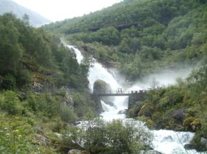 El Glaciar de Briksdal es más grande y turístico que el del día anterior y ya desde la entrada al parque lo pedemos ver colgado de la montaña su tamaño es increíble esta enclavado en un paraje increíble con cascadas que se descuelgan de la montaña a modo de cremallera. Como ese glaciar es uno de los más fáciles de acceder de toda noruega tienen montado todo un negocio a su costa en la entrada con cochecitos que llaman Trolls para ir subiendo desde el aparcamiento hasta la base del glaciar a los ricos turistas que no quieren perder un segundo de su valioso tiempo vacacional dando un paseo hasta la base del glaciar.