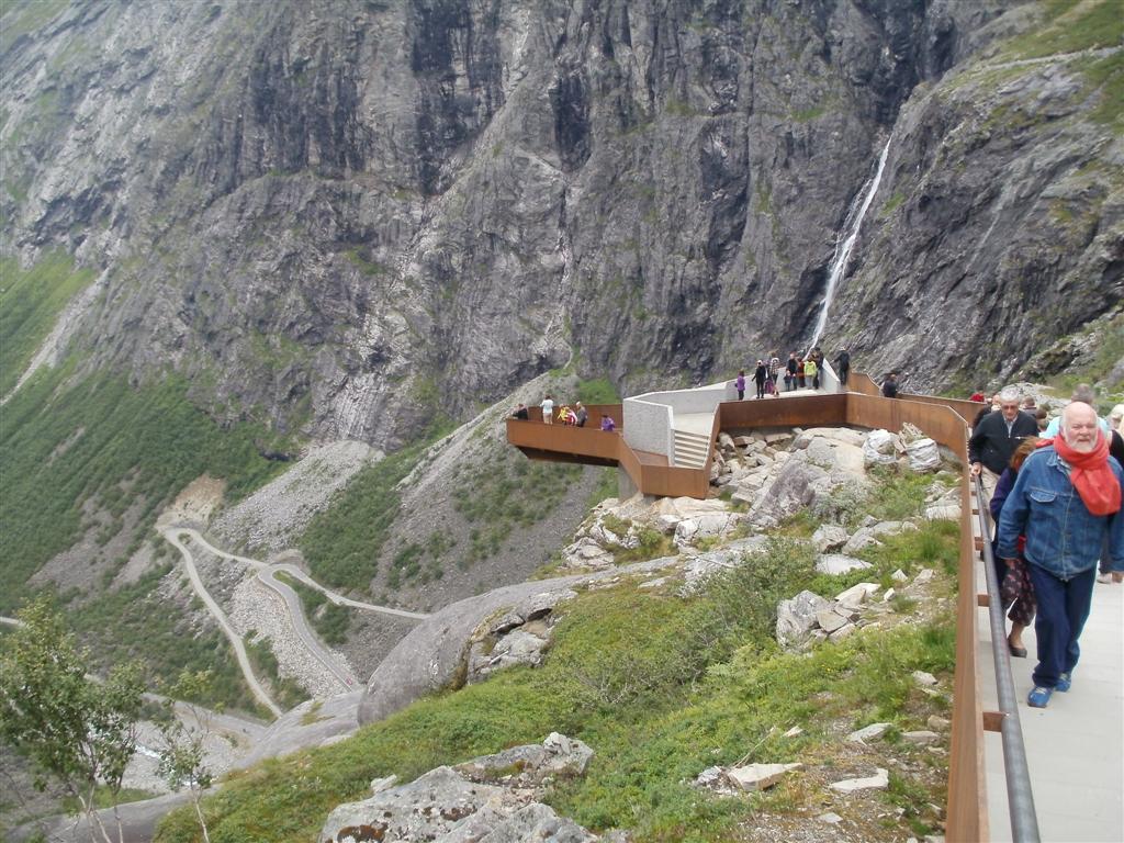Ponemos rumbo norte, hacia nuevas montañas, al lugar donde habitan los Trolls. El paisaje cambiante nos embriaga, alternamos una vegetación exuberante con paisajes rocosos en donde el viento es el rey. Llegamos a la famosa escalera de los Trolls,la Trollstigenque la podemos disfrutar en su plenitud gracias a unos miradores que han instalado. Esta carretera es una de las atracciones más famosas de noruega, debido a su empinada inclinación del 9% y once curvas de 180º, en la ladera de la montaña.