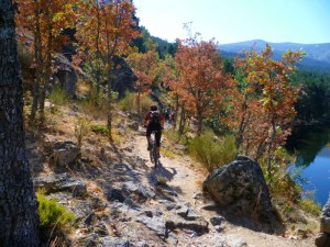 El puente es el punto más bajo de la ruta y donde cambiamos el rumbo 180 grados para volver de nuevo hasta la salida pero por el otro lado de la carretera, por unos senderos maravillosos junto al río Lozoya que nos dejarán en la presa del pradillo, uno de los rincones bonitos, bonitos de la de comunidad de Madrid y en done el otoño ha comenzado a teñir de ocre los árboles. Una vez alcanzamos la pista, Cristian decide subir por carreta y nos deja, mientras el resto muy tranquilamente comenzamos el calvario de la subida, que para los pros será una maravilla ya que