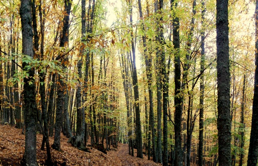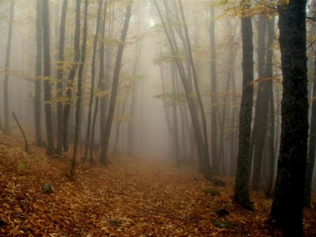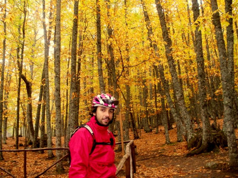 Al llegar al Castañar comienza a llover ligeramente, los castaños no protegen de la lluvia que apenas nos moja mientras la oímos con resuena sobre nuestras cabezas. Rodar por el castañar en esta época el año es adentrarte en un mundo de fantasía, de luces, de colores de aromas, de sensaciones que vives a flor de piel y te deja una paz interior como pocos sitios son capaces de lograr. El poeta francés Paul Verlaine dijo una vez Los sollozos más hondos del violín del otoño son igual que una herida en el alma de congojas extrañas sin final. Hemos tenido suerte y podemos disfrutar del castañar en su plenitud, cuando cientos de hojas muertas yace cubriendo el camino sobre nuestras cabezas en la cúpula arbórea de un bosque encantado, el otoño tiñe de ocre el olvidado verano empapándonos de hojas doradas que son ofrecidas por el viento. Rendimos culto al abuelo visitándolo como cada año y continuamos rodando por las sendas que ofrece un bosque que ha decido deleitarnos con la niebla ofreciéndonos un
