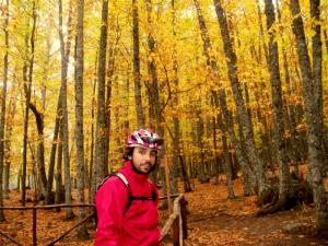 Al que si nos encontramos es a Adrián, lector del Blog y del foromtb que se presta amablemente a sacarnos una foto, muchas gracias, charlamos brevemente y continuamos rodando hasta ver donde termina la senda. Nos encontramos unas escaleras artesanales que suben hasta plataformas en los árboles, no cabe la menor duda que tiene que ser un mirador maravilloso un día despejado para disfrutar del castañar en toda su magnitud. La senda parece divertida pero se va perdiendo y cerrando entre la maleza como la niebla, por lo que decidimos dar media vuelta y emprender el camino de regreso al coche, tal y como esta el día subir al pozo es una tontería ya que no se vería nada.