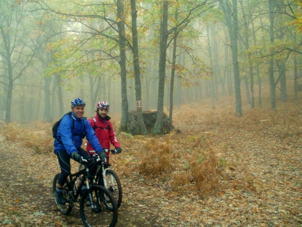 Al llegar al Tiemblo el tiempo es seco, esta nublado, las alturas lucen un sombrero a modo de niebla y hace frío. Vamos lo que podemos denominar un día ideal de otoño para montar en bici para dos frikis del MTB. Con las primeras pedaladas comienzo a sentirme a gusto en la bici, lejos ha quedado la aversión a dar pedales que incube en Noruega y poco a poco voy disfrutando cada vez más de la bici. Jaime sigue aburriéndose con mi ritmo patético pero como ahora me pongo pulsómetro me puedo justificar algo jejeje.