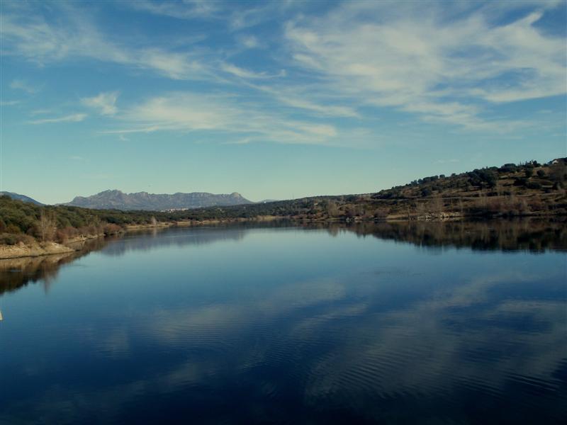 La pista del canal alto nos dejará en el embalse de Pedrezuela, esta pista me trae buenos recuerdos de haberla recorrido con suguss desde Alcorcón y con mi primo Borja desde Tres Cantos. Las vistas desde el embalse con la sierra del fondo y el azul precioso del cielo reflejando en sus aguas dejan una estampa preciosa, tan solo rota por el zumbido de las motos saltando en un circuito cercano. Dejamos atrás el embalse y por pista llegamos al pueblo de Pedrezuela con sus cuestas graciosas en donde decidimos tomar de nuevo un bocado que todo lo que teníamos que subir en la ruta ya lo hemos subido. Tras el plátano de turno nos queda bajar y disfrutar de la joya de la ruta, el cañón del Guadalix.
