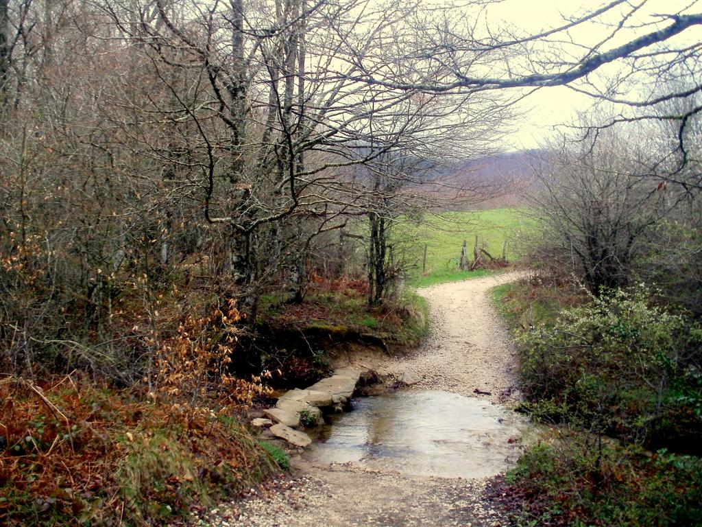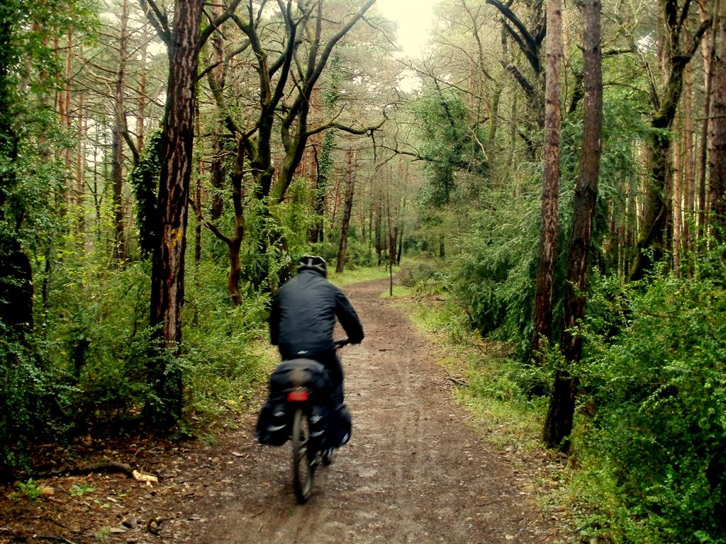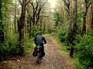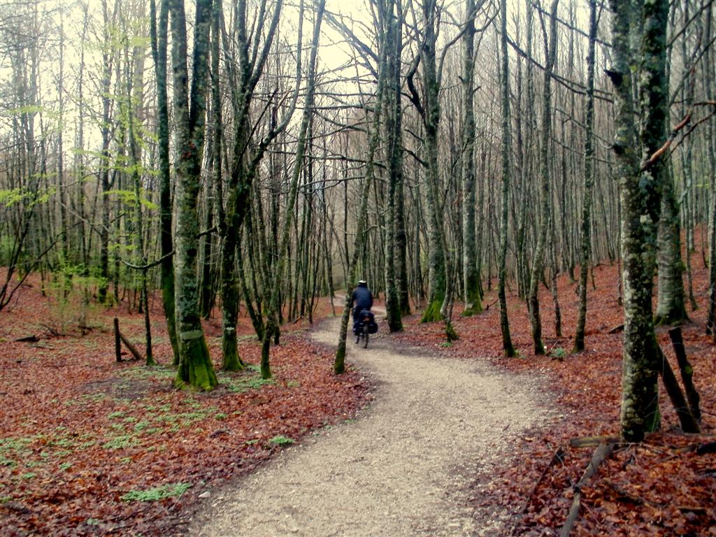 La noche anterior todos nos habían dicho que no se podía bajar de Roncesvalles en bici por el camino dado la cantidad de barro que había acumulado. Pero yo ya estoy un poco escarmentado de estos comentarios, “con la bici no se puede” y decido comprobarlo por mi mismo. Los senderos que nos encontramos son maravilloso, las alforjas son un lastre para la diversión a lo que bajar se refiere pero toda una delicia a la hora de vivir como te gusta.