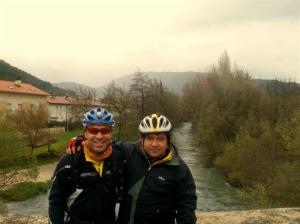 En las subidas nos toca empujar ya que la pendiente y el barro sumado el peso de las alforjas nos impide progresar pedaleando. Antes del alto Mezquiriz nos toca sortear un río que dado el caudal con el que baja ha inundado el paso y tenemos que portear las bicis con la ayuda de los
