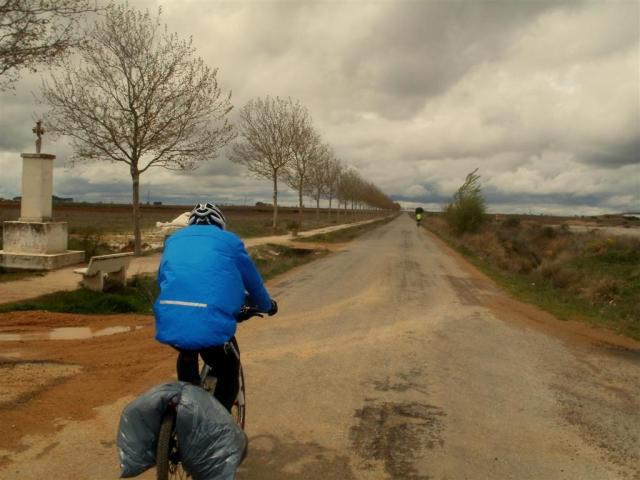 peregrinas que sueles ver en la mayoría de blog sobre el camino, pero hace frío, llueve y Alexis prefiere rodar mas que estar posando para la posteridad. A la salida de Sahagún vemos venir un buen aguacero que lo evitamos bajo un puente, el viento es cada vez más fuerte y cada pedalada es un sufrimiento al punto de llegar a frenar la bici si no pedaleas y eso que el camino perfectamente asfaltado es en ligera bajada.