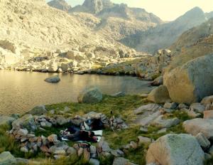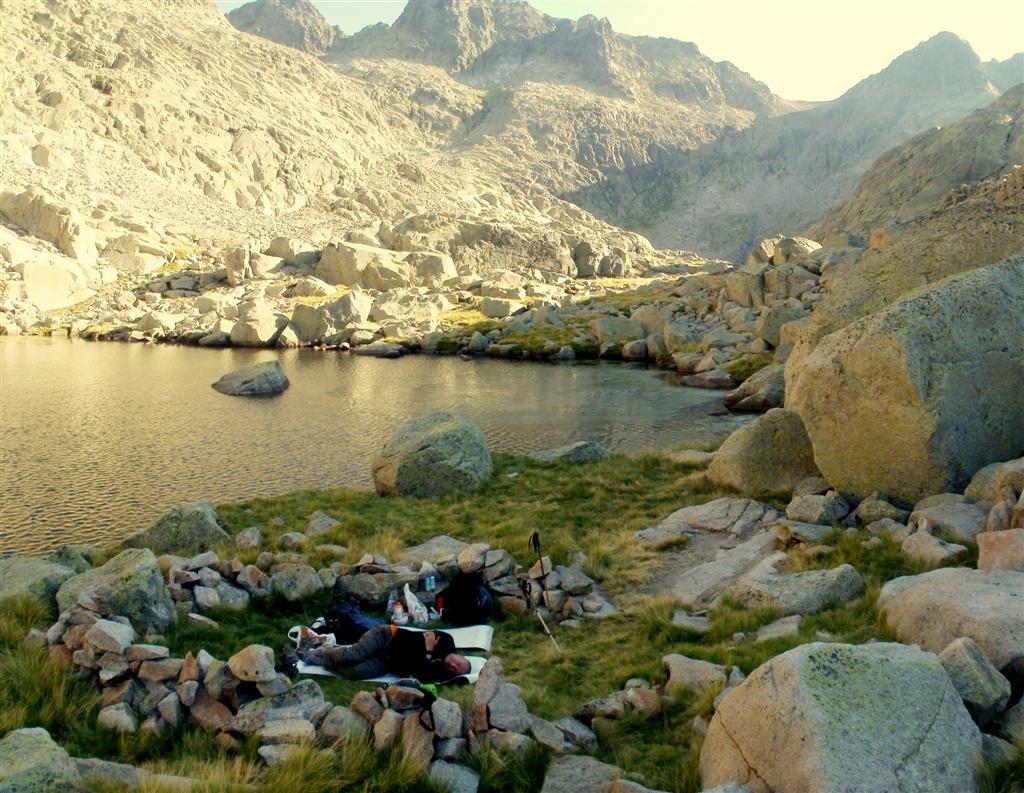 Los verdes pastos se reflejan en el agua como espejos que nos muestran las cumbres asomándose a lo alto y una esplendía moza tumbada tomando el sol con su bikini tanga dando el toque perfecto al paisaje. Cuando la vi quise pensar que la tienda que vimos montada en lo alto de las rocas dando a las dos vertientes y controlando todo el entorno era la suya, que es la ninfa de estas lagunas, una sirena de agua dulce y pulmones de altura que vive disfrutando del calor del sol y las heladas aguas en la paz de las cumbres. Estamos tan cansados que decido quedarnos el primer vivac de los buenos que vemos frente a la laguna Mediana.