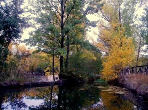 viandas que a reunido a gran parte del pueblo lo que nos complica circular con las bicis y las alforjas. Decidimos renunciar a la invitación de la benemérita y encontramos en las afueras del pueblo un acogedor parque en donde degustar una barrita y hacer una pausa. En la salida del pueblo nos encontramos con la información del camino del Cid que pasa por esta población y una graciosa cabeza de rey cerdo verde que no podemos evitar inmortalizar posando Despistado con ella. Pero lo mejor es el paseo arbolado de la salida engalanado con los primeros colores del otoño y un precioso estanque.
