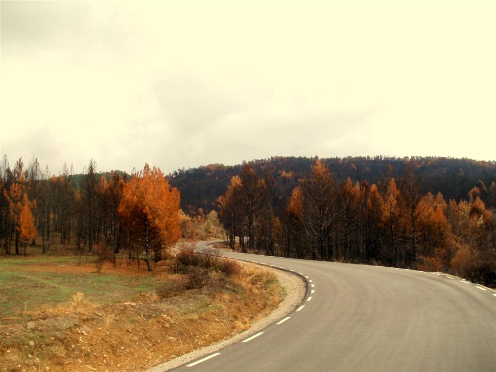 Una vez hemos repuesto las fuerzas nos toca volver a subir y esta vez con las secuelas del desagradable paisaje del incendio forestal que le toco vivir a la localidad de Chequilla. Yo nunca había estado tan cerca de una zona afectada por un incendio e impresionan, el corazón se te encoge y sientes rabia por ver el paisaje muerto, los troncos yaciendo en sus lapidas negras de carbón y el ocre de lo seco, de lo yermo coronando las copas de los pinos que no se chamuscaron.