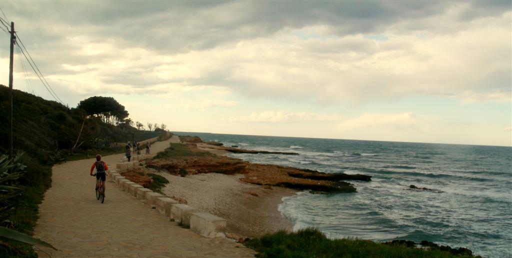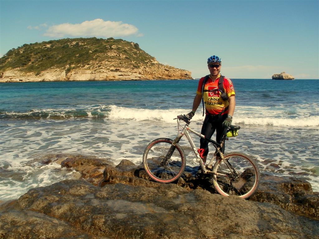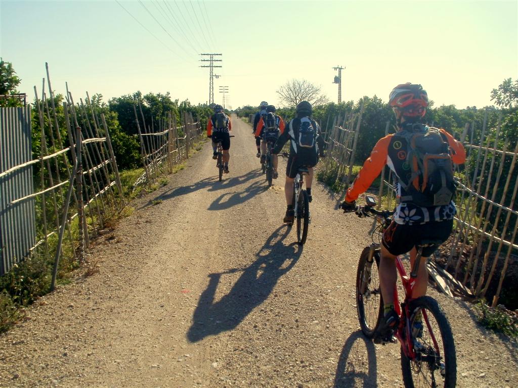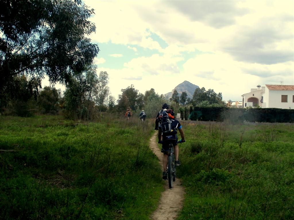 Y así amanecimos en Denia con cielo azul precioso, una previsión del tiempo muy decente y el mar algo embravecido dándonos los buenos días mientras terminamos de ajustar las bicicletas para comenzar la ruta. Lo primero que hacemos es ir a comprar agua y llenar nuestras mochilas ya que en esta ruta las fuentes no abundan y es mejor salir con los deberes hechos de casa a pesar del peso extra que te toca acarrear. Los primeros kilómetros son llanos rodando por asfalto entre cultivos de naranjos y casas de planta baja, pronto nos adentramos en la vía verde de Denia que recorreremos unos kilómetros hasta dejarla en cuanto nos aproximamos a la sierra del Montgó en donde las primeras cuestas comienzan a sacarnos los colores y el barro a decorar nuestras bicis. Pero como todo tiene recompensa rodamos por las primeras sendas divertidas que el barro las hace algo intensas de rodar ya que la rueda delantera opta por tomar su camino, el tramo es corto pero divertido, ahora nos toca enfrentarnos al río gorgos que pensábamos no podríamos rodar por sus sendas por el agua que traería pero no. Podemos rodar sin digamos muchos