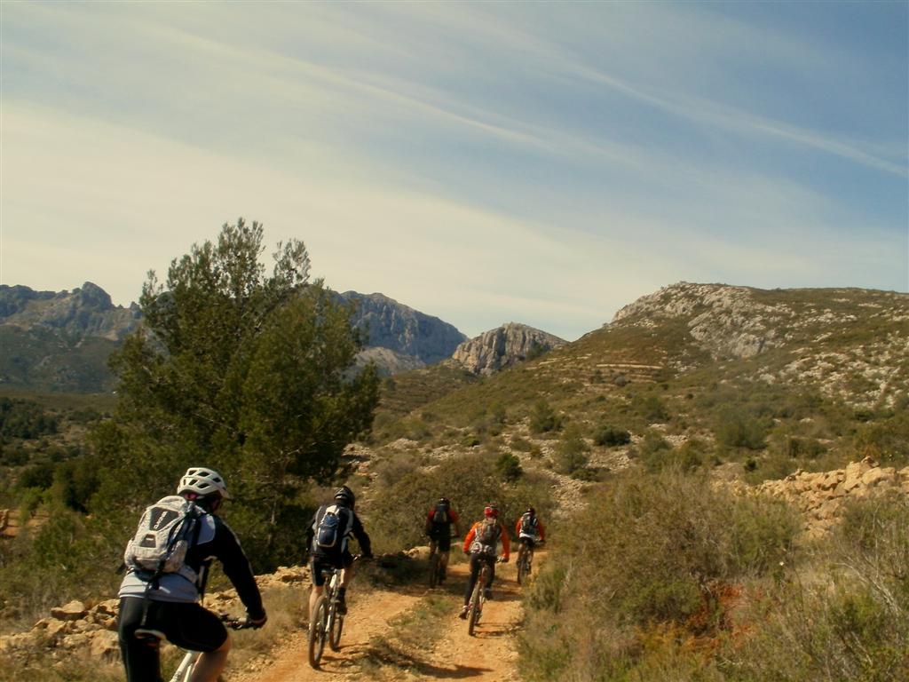Mientras nos preparamos vemos como los máquinas de la zona ponen a punto sus piernas calentando motores, mientras lucen sus preciosas máquinas de carbono y muchas tentadoras nuevas 29 pulgadas. Dejamos Xaló antes de que diesen la salida tras dos hermosas féminas y ponemos rumbo hacia Benissa por la carretera con una ligera y agradable pendiente ideal para ir entrando en calor ya que la mañana es fresca. La carretera da sus frutos y según la dejamos para tomar la pista hacia la zona del Mosereg hacemos una parada para ir quitándonos la ropa de abrigo.