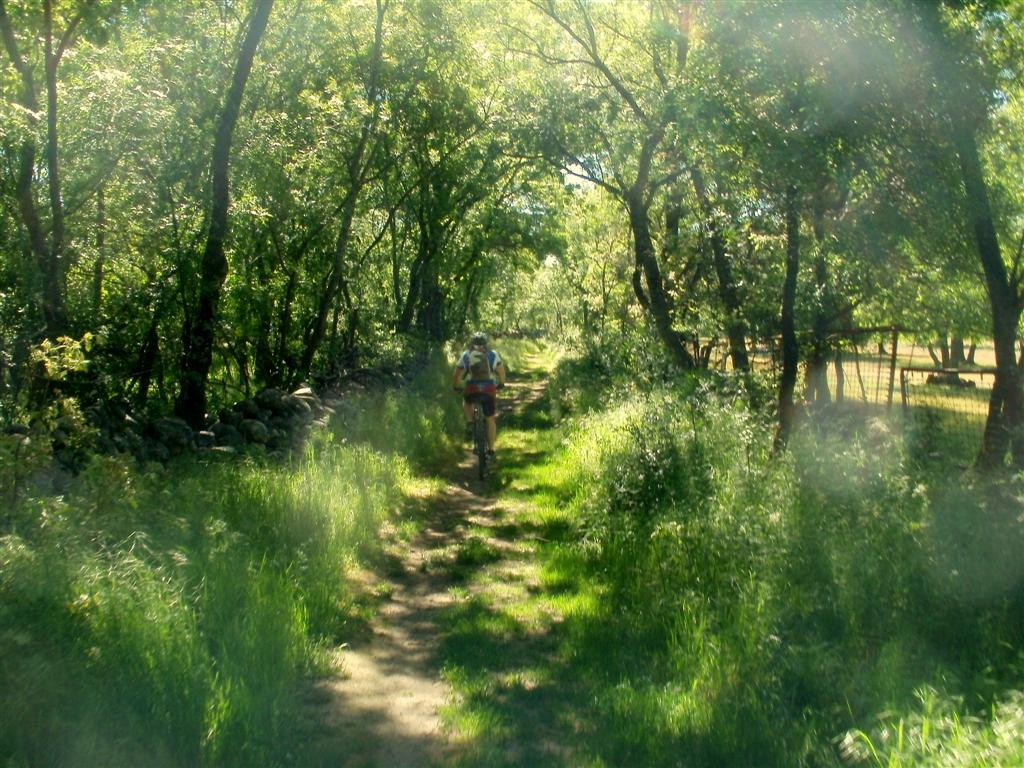 Es tarde y mi gps interno se pone en modo recalculando recorrido para por lo menos disfrutar de lo que nos queda de mañana, en mi cabeza dibujo la ruta, un boceto de algo que puede ser divertido y original. Para empezar nos damos una vuelta por la cantera de Becerril, uno de esos rincones olvidados y perdidos por sendas de transito que pillan a desmano pero de vez en cuando es bonito visitar, este lugar es bonito por las tardes, cuando hay menos luz y la sierra se vuelve más acogedora. Hace fresco y el sol se agradece, me quitado la manga larga y comienzo a echarla de menos. Dejamos atrás los cercados de la calzada para ir en busca de los cercados de los Arrojuelos, localizar el paso hacia ellos desde la salida de Montellano lo tengo un poco difuso pero conseguimos dar con ellos, disfrutar de la exhuberancia de su vegetación, presumiendo de un verde intenso que la hacen una delicia rodar por ellos, además de ser un acceso muy directo para ir de Becerril a Moralzarzal o a la base del cerro del telégrafo que es donde vamos.