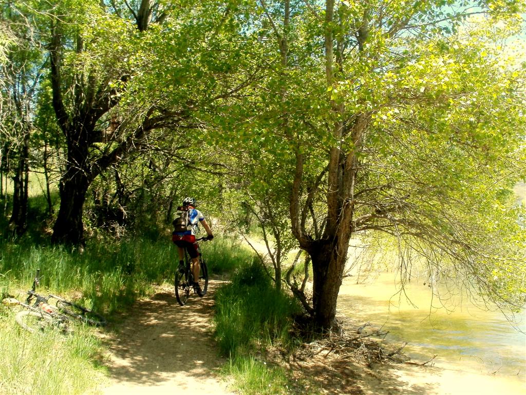 disfrutando de las sendas que dan a Reajo del roble cerradas y aromáticas a media altura para sentir el aroma a sierra. Damos la vuelta a la presa por la zona del antiguo chiringuito, la presa esta hasta los topes de agua y eso solo significa que luce sus mejores galas, esta simplemente maravillosa, resplandeciente y es una autentica delicia rodar por su orilla, por sus sendas disfrutando de los contrastes del verde intenso de a vegetación con el azul profundo del agua, tornándose en esmeralda cuando se aproximan ambos.
