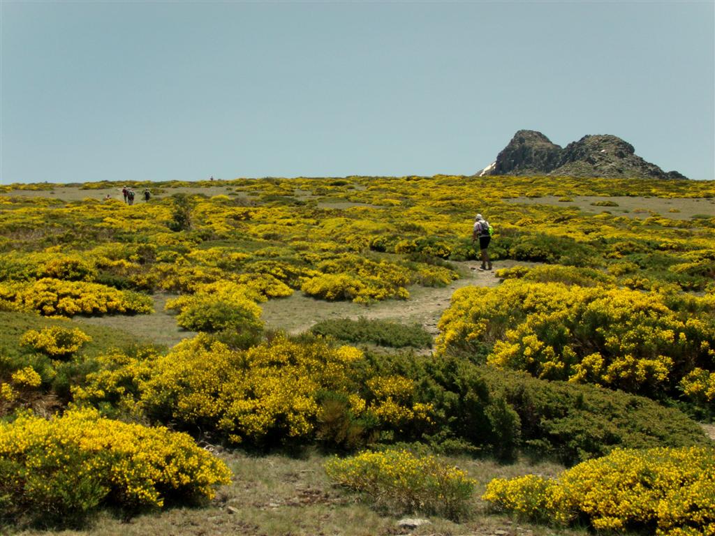 El camino hacia la cumbre de Peñalara es como una tremenda romería y además se esta celebrando la Gran Trail de Peñalara y los corredores ya muy machacados por la dureza la prueba tienen un punto de control justo en la cumbre, en donde me siento para disfrutar de las vistas, del aire puro, del fresquito y del valor de quien afronta con una sonrisa 110 kilómetros tras haber estado caminando toda la noche.