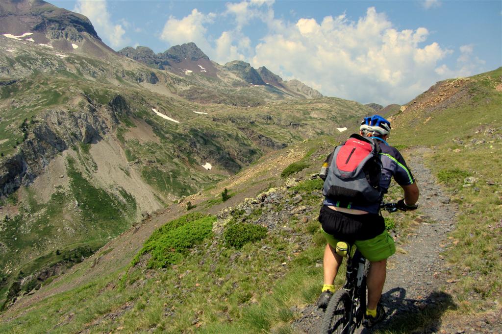 Joaquín no conocía el lago así que nos metemos unos metrillos de subidos y disfrutamos del preciso lago, que esta vez no esta para un bañito, el cielo se ha encapotado una tormenta procedente Bielsa va ganando altura siguiendo el valle de la pista. Nos toca remontar la senda de subida al puerto de Urdiceto y de nuevo con la bici sobre los hombros coronamos los 2403 metros bajo tímidas gotas que se escapan de la tormenta que esta descargando con ganas en el lado de la montaña de España. Y decidimos emigrar, entrar en Francia y dejarnos caer por una senda que nos cuesta ciclar y en gran parte, bueno en su mayoría bajamos caminando siguiendo uno track que pensamos bueno y al final decimos bautizar cariñosamente come el de Tontíco ya que el se perdió y no hizo perdernos a nosotros también.