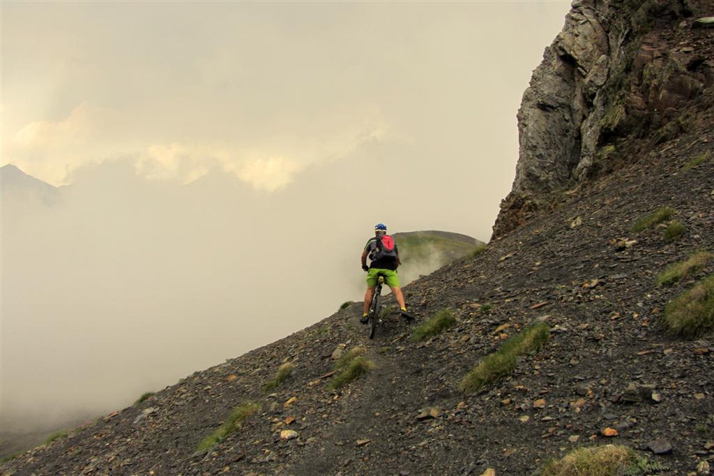 IMG_9240 (Large)Este tramo de la ruta que une el puerto de Urdiceto con el puerto de Plan se nos atraganto, ya no solo por la dureza de la subida y ausencia de una senda clara, sino por el tiempo que comienza a complicarse dejando caer algunas gotas de vez en cuando y avisando con truenos continuamente que se amplifican entre los colosos pétreos por lo que vamos caminando. Es la hora de comer, pero decidimos no perder tiempo hasta alcanzar el puerto de la madera y tener claro que tan solo nos queda bajar. Durante la subida vamos disfrutando del espectáculo que van dejando las nubes a nuestra espalda hasta que coronamos el puerto de Plan y flipamos con las vistas que tenemos ante nosotros, algo increíble que solo se puede disfrutar con esfuerzo. Estamos a 2.524 metros de altura y las piedras pequeñas, finas los justo para no ser arrastradas por el viento reinan sobre la superficie. Te da la sensación de estar rodando por otro planeta y si a esto le sumas que justo cuando cuándo cruzamos la pared de Peña Blanca la niebla nos alcanzo dejándonos ver apenas un metro delante nuestro te trasladan a otro mundo en el que la adrenalina y el esto se esta poniendo muy feo comienzan a apoderarse de ti.