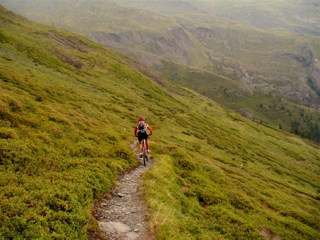 OLYMPUS DIGITAL CAMERAHasta la cabaña de Sallena todo ha sido sencillo y disfrutón, pero ahora empieza la dureza de la ruta, la pista desaparece y la senda es la protagonista, se deja rodar en gran medida pero comenzamos a empujar la bici en largos tramos bien por la inclinación o por lo embarrado del terreno, el paisaje comienza a cautivarnos, es como si las cumbres fuesen la sirenas que narraba Ulises en sus viajes que con sus cantos devoraban a los incautos que se dejaban seducir, para nosotros es tarde vamos como embobados hacia ellas. El barranco de Matarruego y una vez que cruzamos el arroyo fue el punto en el que perdimos nuestra virginidad cicloalpinista, bici al hombro y para arriba, paso a paso, con humor y soportando los terribles mordiscos de unos mosquitos que parecían leones. Pero es cuando alcanzas la cima de la loma cuando flipas con una senda ciclable, medio en llano, medio en bajada dibujada sobre una pradera verde preciosa y como fondo una fondo de pantalla increíble que me bajaría sin dudarlo y es cuando te das cuanto que no puedes bajártelo, que estas en él, estas cumpliendo un sueño, estas rodando una realidad que habías soñado hasta ayer. Y te das cuenta que en el mtb es como la vida, los senderos maravillosos son como los perfumes caros, cuesta mucho disfrutaros, son intensos y cortos pero te dejan una paz interior increíble.OLYMPUS DIGITAL CAMERA