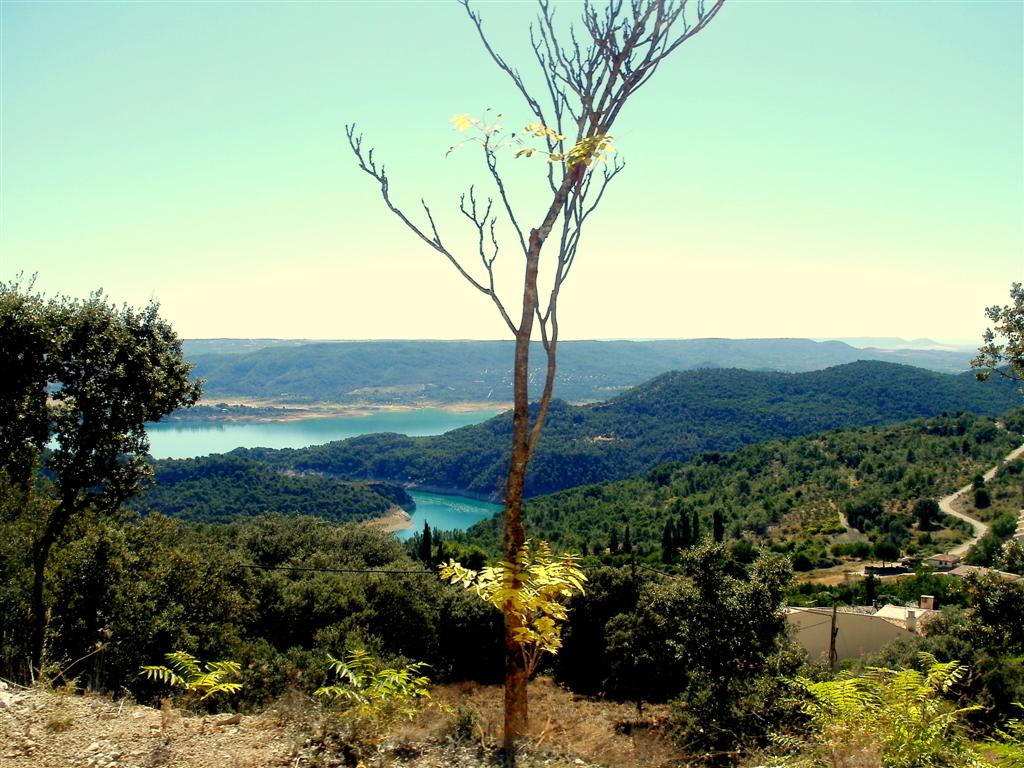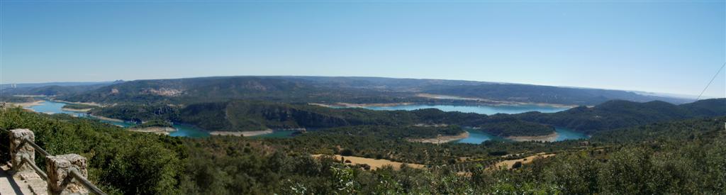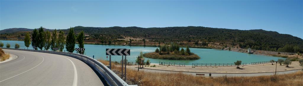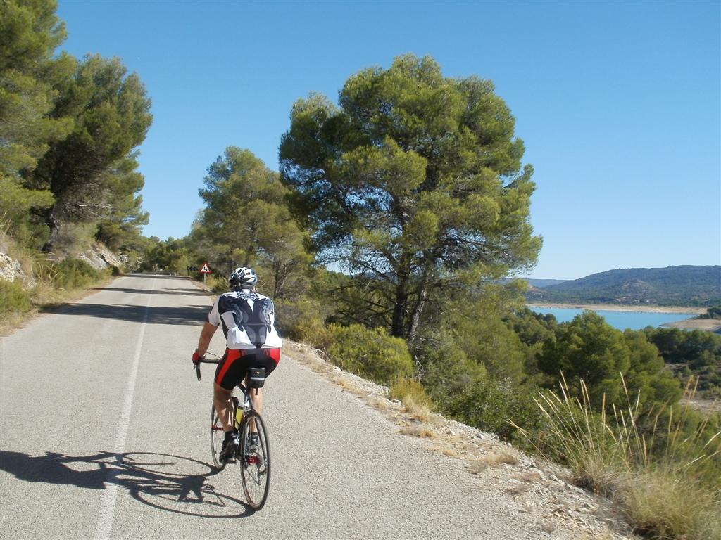 El día es fabuloso, el azul cielo nos rodea por todas partes ya que el embalse luce el mismo color, los barcos anclados rodeados de montes dejan una estampa curiosa mientras pedaleamos unas rampas que nos hacen ganar altura y alcanzar el dique de la presa. Unas obras de mantenimiento en los túneles no nos permiten hacer la ruta como la teníamos pensada y nos liamos un poco, pero una vez encontrada la carretera pintoresca comenzamos a disfrutar pedaladas de libertad, el placer de poder disfrutar una carretera sin ruidos, humos, pitidos en una gozada, un placer prohibido que en rincones de la alcarria aún puedes encontrar. La carretera va ganando altura poco a poco, en los últimos meses JJ ha ido a mas en la bici y yo a menos, me va dejando atrás a medida que la subida va ganando algo de pendiente, apenas me doy cuenta ya que mi vista va perdida en el embalse, en sus aguas azuladas con zonas de verde turquesa, en calas maravillosas que me gustaría recorrer con una piragua. A medida que vamos ganando altura el embalse nos deja ver su grandeza, su silueta abrazando montículos que lo desafían formando