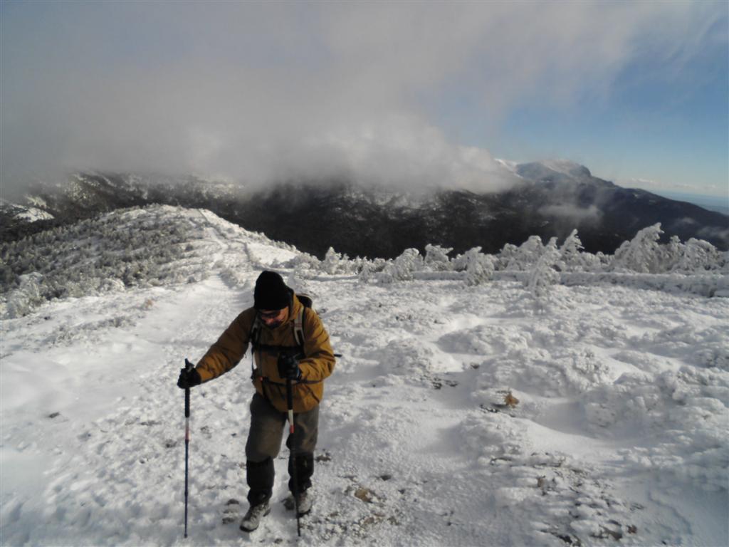 Alcanzamos el collado de Marichiva y decidimos ponernos las polainas. La nieve esta dura pero en las zonas donde el viento la acumulado te hundes bastante. A medida que vamos ganando altura por la siempre simpática cuesta de la peña del águila el sol se deja ver tímido por entre unas nubes que circulan a velocidad de vértigo y que cada vez son menos dejando un cielo azul intenso que en contraste con al blanca nieve dan al paisaje un tono majestuoso. Un bosque de árboles helados y esculpidos por el viento flanquean el camino, el entorno es espectacular, reina el silencio entre nosotros disfrutando de unos momentos de autentico lujo, la gente camina disfrutando fotografiando cada momento cambiante por la luz que hacen que la estampa cambie asombrándote aún más si cabe. Al llegar al la cima de la peña del águila el viento nos castiga como casi siempre en este lugar, pero ver a la maliciosa jugando con las nubes no tiene precio. Adoro el