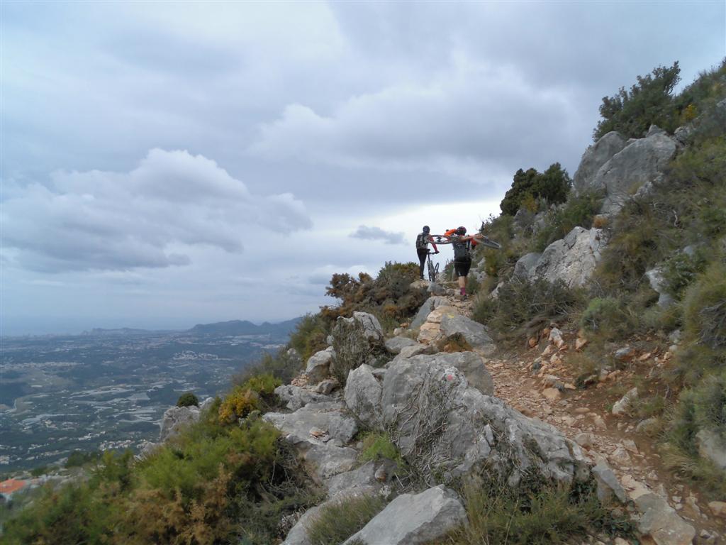 Tras la bajada nos toca pedalear un rato disfrutando por pistas y alguna subida por asfalto para terminar entrando el sendero de las cabezas de niño y los arbustos que pinchan, una senda que te deja los brazos destrozados y las piernas finas de pedalear, ya que si pierdes un poco de inercias te quedas. Tras sufrir el sendero en ligera subida queda disfrutar de la trialera de bajada a Xaló. He reparado la doble y las sensaciones que tengo con ella son increíbles, me da seguridad y puedo superar todos los escalones, IMG_3219 (Large)piedras y raíces que me encuentro sin dudar. Bajo con seguridad, alegre hasta que me veo volando por los aires y aterrizando sobre le hombro. Al incorporarme siento que no puedo levantar el brazo, me duele muchísimo. Pienso que me he dislocado el hombro pero en un movimiento siento como si recolocasen los músculos del brazo y comienzo a sentir Menos dolor recobrando movilidad poco a poco pero sin poder recobrar la movilidad completa.