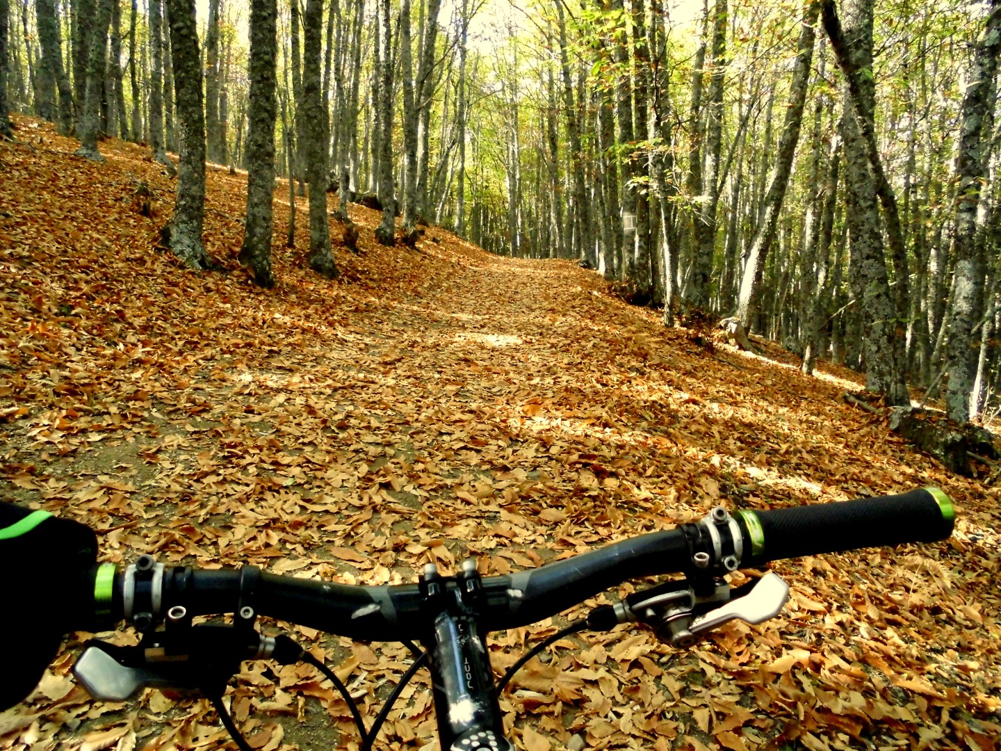 El sol comienza tímidamente a calentar, nos guardamos las prendas de abrigo en la mochila, toca subir y pronto entraremos en calor de forma natural. Salimos del tiemblo, frente al hotel que es un punto de quedada muy común para la mayoría de la comunidad biker que tenemos esta localidad marcada en el calendario como de visita obligada. Subimos por la pista forestal del otro lado de la carretera, buscamos la tranquilidad del entorno y subir de charleta. Estoy con pocas fuerzas y últimamente la relación con la doble no transcurre por nuestro mejor momento. Salvo algunas parejas buscando setas por este lado del monte se respira paz y nos damos un respiro en la primera fuente para reponer agua. En apenas unos minutos nuestro mundo cambia radical y empezamos a ver coches aparcados en sitios inverosímiles dado que se han llenado todas las plazas de aparcamiento, junto con un continuo ir y venir de gente con mesas, sillas y cestas para recoger castañas ahogando el sonido del bosque en risas, gritos y murmullos. El castañar luce deslumbrante pero nos sentimos agobiados, siempre hemos venido en días de lluvia o mucho frío con