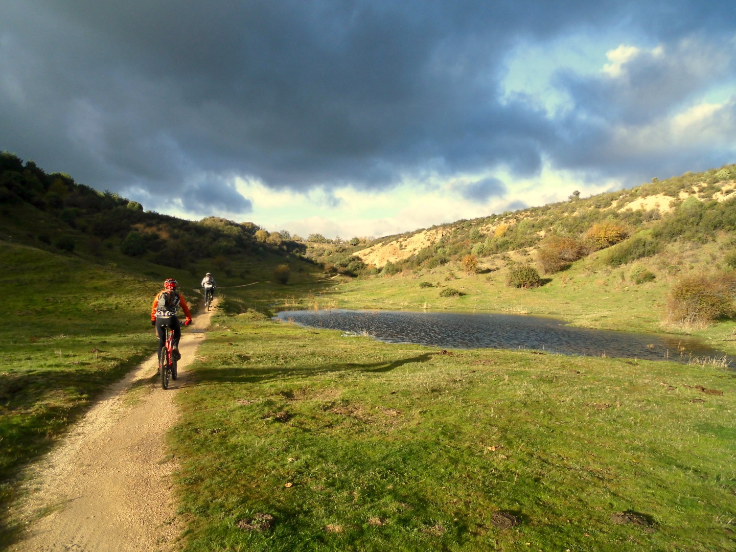 Comenzamos la ruta desde Vistareal, una urbanización a las afueras de becerril y que para mi es la puerta de a los grandes rincones maravillosos que guarda esta zona. Tomamos uno de ellos, la senda del camino de santiago que sube hasta Navacerrada. Los tenues claros que vencen la madeja de nubes que hay sobre nuestras cabezas y amenazan refrescarnos la mañana con un buen chaparrón alegran la senda a nuestro paso. El contraste del marrón de la senda con el verde tapiz de los pastos y la pequeña charca que se forma deja una están preciosa que dibuja mi primera sonrisa del día, añoraba estos momentos de la bici de montaña que tengo muy, tal vez demasiado olvidada. Dejamos la senda del camino de santiago y comenzamos a subir hacia la barranca por la senda divertida que te deja en el puente. JJ se ríe de mí al verme bajarme de la bici para superar pasos en los que jamás me hubiese bajado para subirlos, tengo una falta de confianza con la doble tras la caída increíble. El Karma castiga a JJ duramente por sus risas rompiéndole el amortiguador trasero y obligándole a regresar a casa por la carretera, una lastima porque estaba seguro que esta ruta que tenia pensada le iba hacer coger más veces la gorda.
