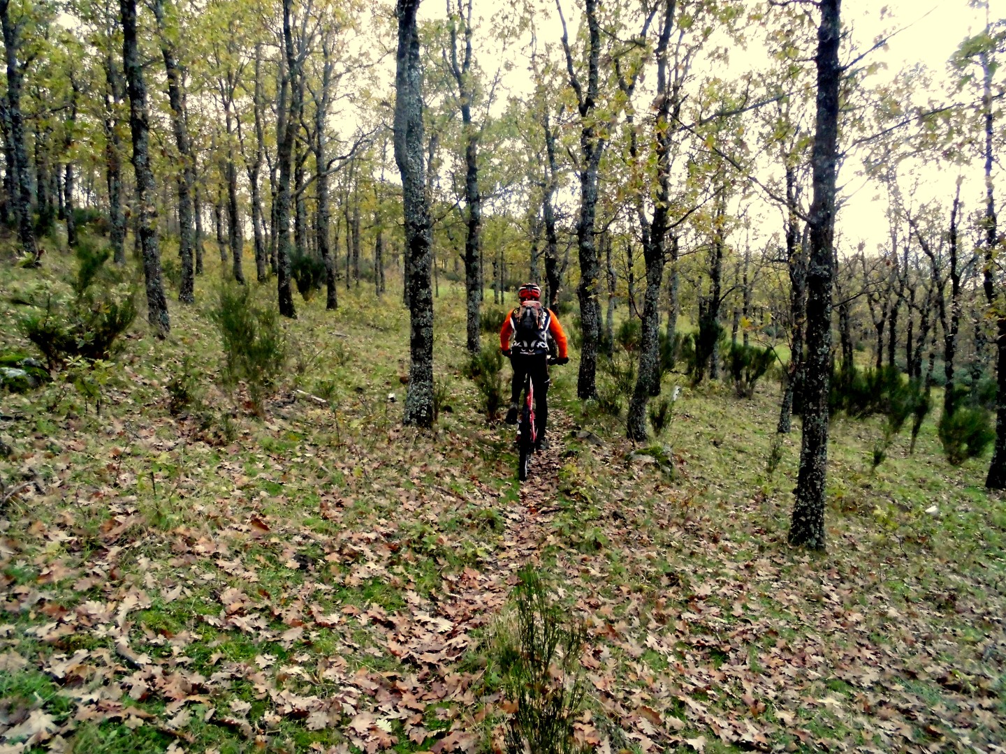 gozada que todo biker tendría que rodar y disfrutar a tope con un flow increíble gracias a la lluvia caída durante la noche. Desde la fonda Real optamos por recorrer la senda JJ, una bella senda que se esta perdiendo por falta de uso y es una maravilla para enlazar collado mediano con Navecarrada sin apenas pisar carretera. En el sentido desde Navacerrada la senda tiende a bajar multiplicando su encanto y el grado de disfrute por un robledal increíble.