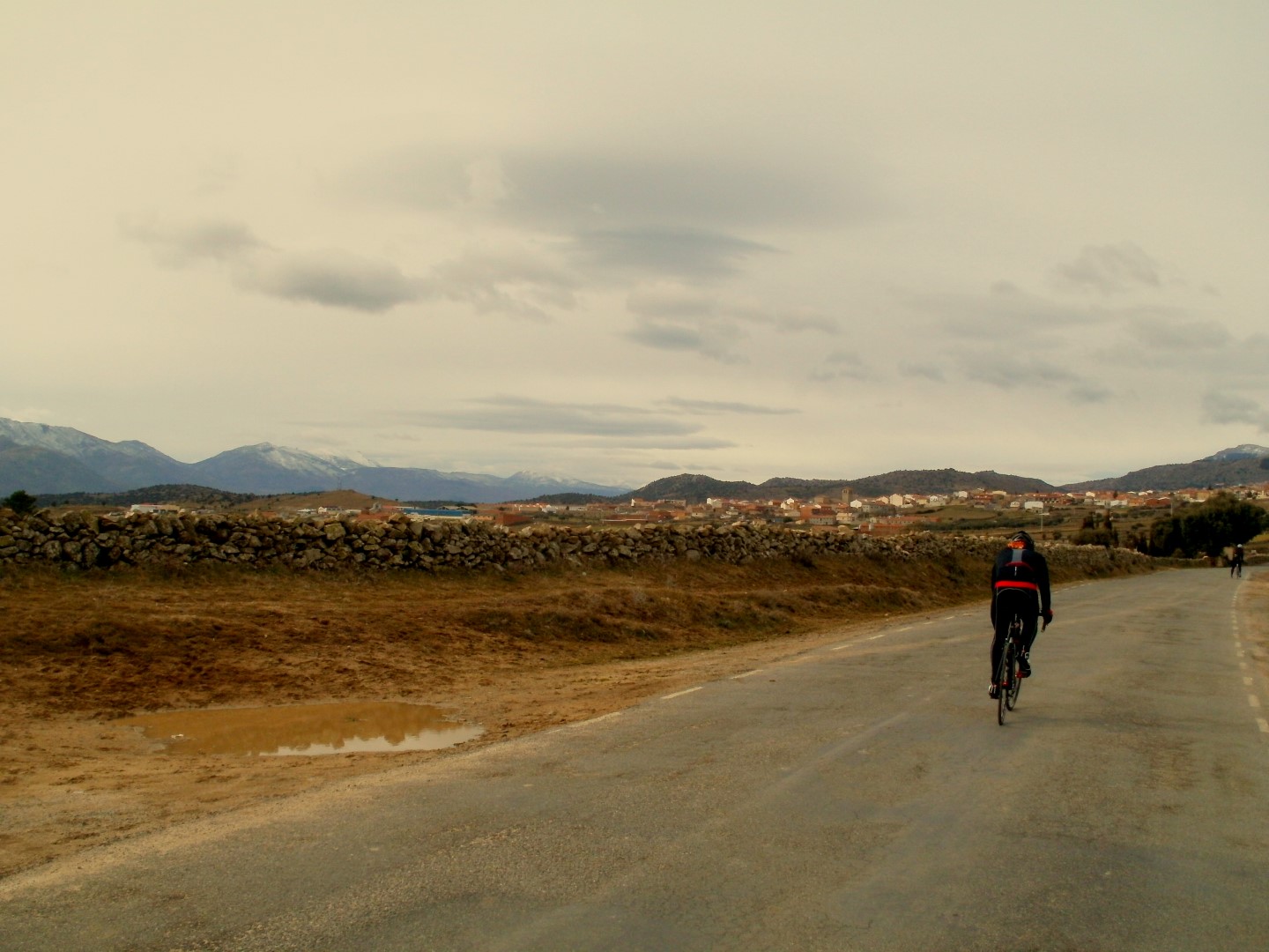 Bajamos hasta San Bartolomé de pinares, un pueblo que me resulta agradable y no por nada en especial pero de las veces que he pasado me ha encantado ver como un mujer muy mayor me la he encontrado bien abrigada sentada al sol en mañanas bien frescas de primavera, siempre me ha dibujado una sonrisa el pensar que las personas mayores de estos pueblos salen con los primeros rayos de sol que calientan los cuerpos para recargar las pilas y aguantar una año más, para decirle al invierno te he superado. La bajada es intensa, el desnivel es gracioso y damos gracias a JJ por dibujar la ruta en el sentido correcto, al llegar abajo nos miramos los tres y nos entra la risa de pensar que tendríamos que subir algo como lo descendido. Mientras rodamos por una carretera con sus tramos de calefacción para no perder calor corporal la sierra de Gredos se estira para mostrarnos sus cumbres blancas.