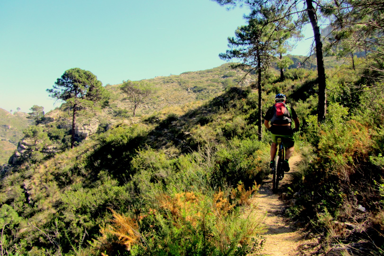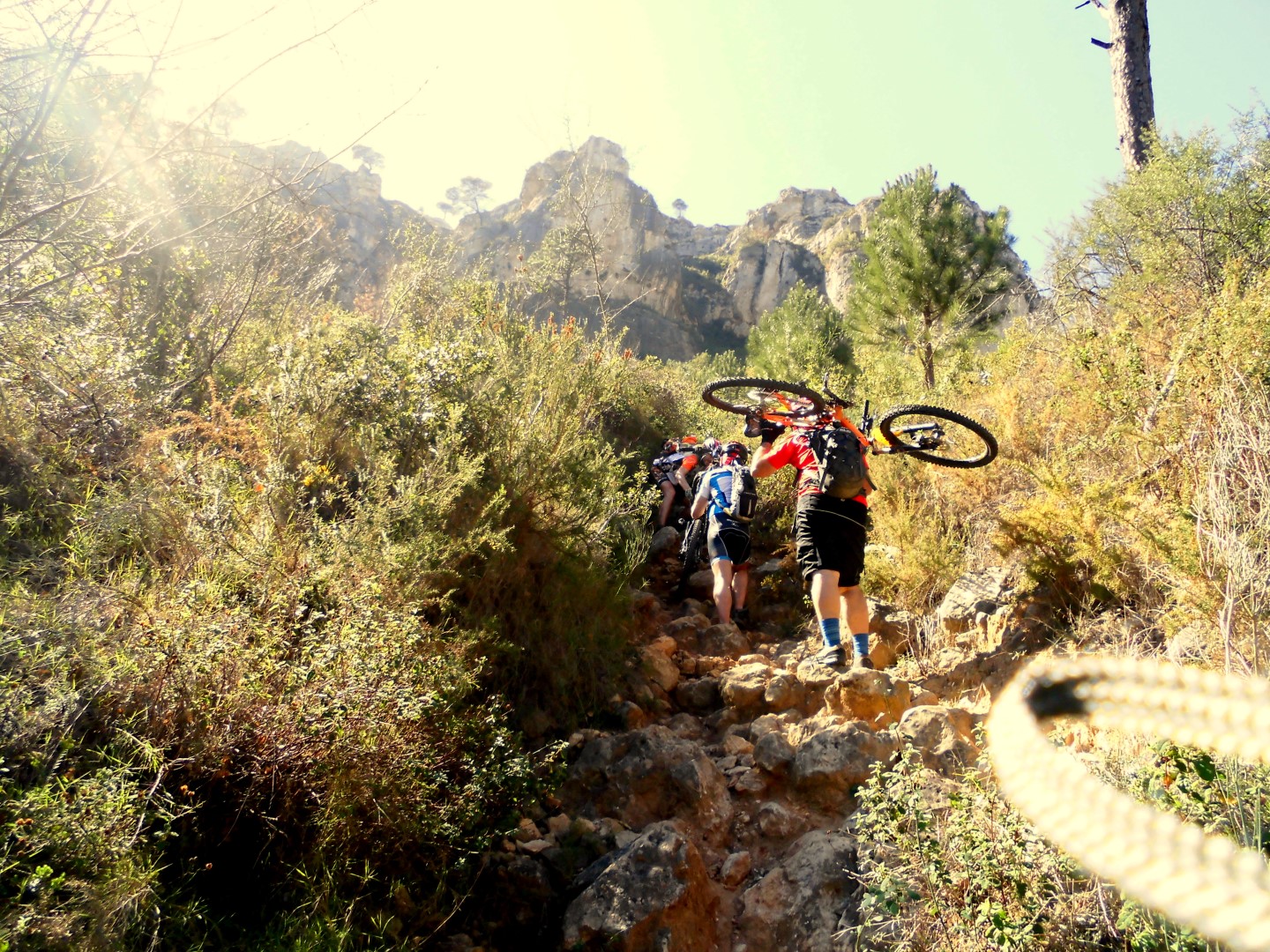 en la dirección correcta, el calor aprieta y el corto esta de moda en el grupo, estamos en la costa, es fin de semana y estas disfrutando de tu bici, no se le puede pedir más a la vida. Bueno tal vez sí, que la pista hubiese sido algo más generosa no llego ni al kilómetro, que la senda a pesar de ser deliciosa sus tramos en subida creciente cada vez tenia más piedra mal puesta y sus tramos ciclables eran cada vez mas cortos, al punto de que terminamos empujando la bici un buen trecho y cuando ya te habías cansado de empujar la bici, toca sacar los apuntes del puerto de la madera y tirar de manual de cómo portear una bici por una senda con una inclinación terrible que incluso andando costaría superar el desnivel. Pero nos gusta el MTB y a base de humor vamos superando lo que ya nos ronda a todos por la cabeza, mal track para montar en bici, pero cojonudo para disfrutar de la montaña Valencia.