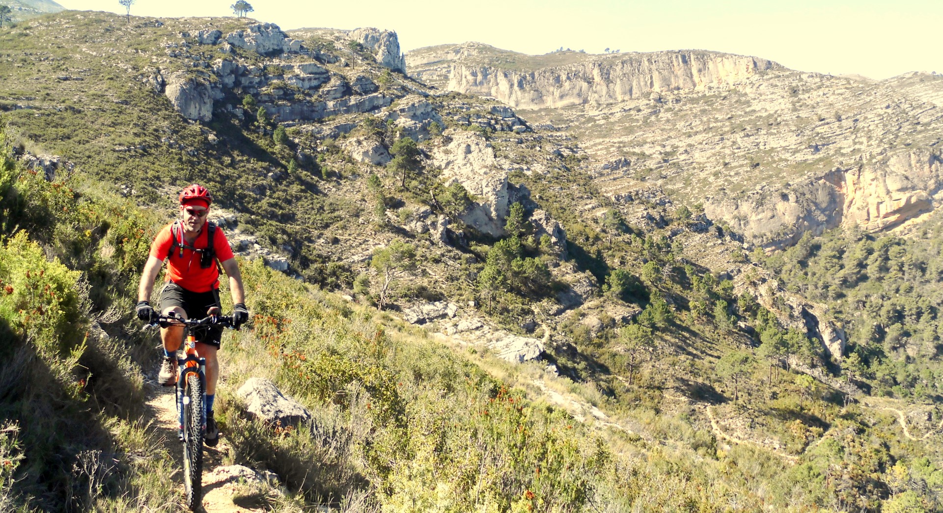 Este vez no salimos montados de la casa y toca pequeño desplazamiento en coche hasta Xeresa, lugar de donde el parte el track. En el aparcamiento el calor nos anima a dejar la chaqueta en el coche y confiar que al final de la jornada la térmica sea suficiente para terminar la ruta sin pasar frío. A lo lejos el Monduver, desafiante nos aguarda y nos ponemos a ello. Nuestro primer objetivo es el cami de la pedrera, que una vez dejamos el asfalto y siguiendo las indicaciones de un paisano nos adentra en el monte por un sendero muy empinado al principio pero con tramos muy disfrutones que nos va dibujando en el horizonte un paisaje de esos que nos gusta con el resuello en los labios pararnos a degustar.