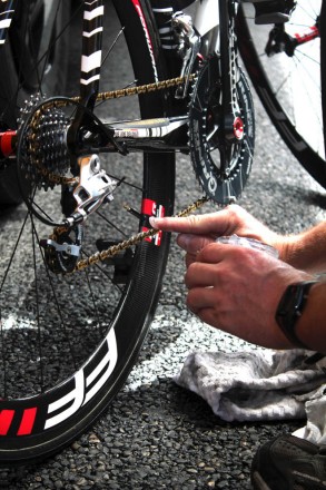 roadPara las bicicletas de carretera se recomienda aplicar un chorro fino en el interior de la cadena a medida que giramos las bielas hacia atrás. Esperar unos minutos para que el lubricante penetre entre los pasadores, placas y rodillos. Secar el exceso de producto con un trapo, se necesita lubricar la cadena en el interior, no en el exterior.