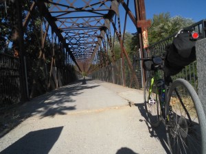 Pronto dejo atrás Alcorcón y en un suspiro Móstoles para salir hacia la vía verde, por el Soto que lo rodé por última vez junto a mi sobrina Jenelle. Empiezo por carretera pero la pista es perfecta para Dora, rueda a una velocidad endiablada, la encanta la pista tanto como el asfalto y se agradece el viento matutino, alcanzo a una pareja en bici, ella luce culote muy transparente, tanto que su tanga luce como un triángulo de advertencia, espectacular. Me hago una foto en el puente de hierro, es una de las cuatro fotos simbólicas que quiero registrar en este viaje, sin contar con las que el camino me tenga deparadas.