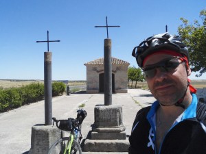 En Fuensalida dejo las pistas para tomar el arcén de la carretera hasta Torrijos, el Gravel te permite estas licencias y a la entrada de Torrijos puedo hacer otra de las fotos básicas del viaje con la señal identificativa de la peregrinación. Los caminos se alternan con carreteras que aparecen de repente, Carmena con su ermita y sobre todo con su fuente a la entrada me dan una tregua a la sed y el calor insufrible.