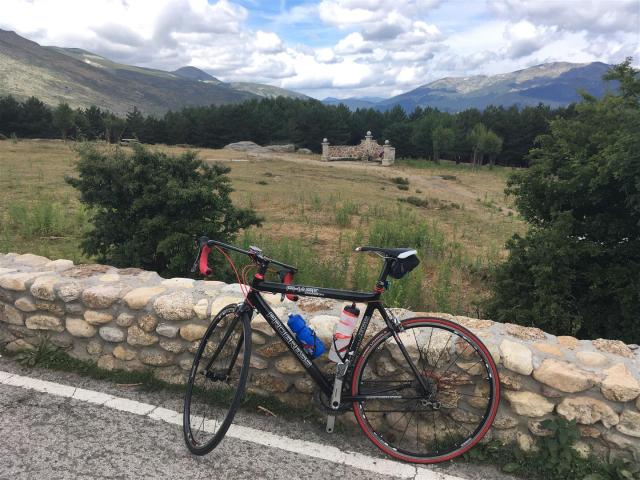 Durante la ascensión me paso todo el que subía, incluso un señor mayor con bici de muchos kilos y acoples de los 80. Al fin corono Morcuera y sigo, no tengo ganas ni fuerzas ni para frenar, me dejo caer hasta la fuente, bebo agua, bajo un poco más y me doy la vuelta, tengo frío, el cielo esta para tormenta y no tiene sentido bajar más. En el corto tramo que hay desde el refugio hasta coronar de nuevo el puerto me pasa Patri, no la conozco es lo que ponía sobre su culo, por su forma de pedalear y sufrir sobre una bici se la ve toda una luchadora. Después me pasa una moto y de paquete un ciclista cargando con su bici al hombro, lastima no ir grabando con la cámara.
