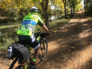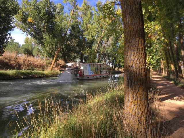 Una vez alcanzamos el Serrón donde se unen los ramales del canal, comenzamos a rodar por el que hemos elegido el ramal de campos, que yo no había rodado nunca, ahora si podré decir que he recorrido el canal al completo. En rutas como está siempre me pasa lo mismo, cuando el paisaje comienza a ser anodino la ruta pierde interés, Jorge disfruta rodando veloz, pero yo no le encuentro a mi bici de MTB el punto que si tengo con otras, nuestra relación es más fría y distante, no le encuentro el punto de disfrute que tengo con la de carretera, ni la pasión desenfrenada casi salvaje que vivo con la de Gravel, ella es como una fuck buddy para viajes donde como en este la ruta de calleja condicionaba la montura. Los pueblos pegados al canal van pasando, algunos presumen de ser uno de los pueblos más bonitos de España. El canal esta desierto salvo un puñado de pescadores diseminados por todo el canal. Nos quedamos sin agua tras la tentativa de encontrar agua o un bar para comer tenemos que racionar las cuatro gotas que nos quedan en los bidones. Reponemos agua al fin en Belmonte, cuando las fuerzas van estando justitas y la sed se acrecienta. Una sombra con frutos secos y gominolas nos da la vida, lo suficiente para terminar los últimos kilómetros que dejaran en Molina de Rioseco en donde nos cruzamos con el barco turístico a palas del canal que es todo un espectáculo.
