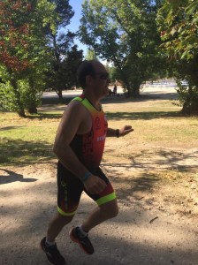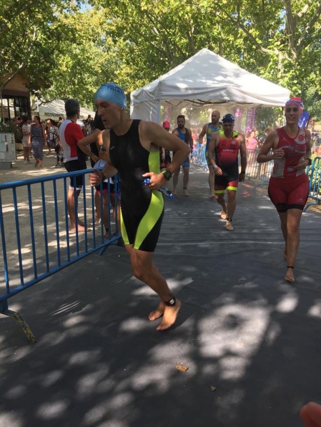despiertan, bajo piñones y adelanto a muchos ciclistas, bajo rápido, subo la rampa de tierra montado sorteando a ciclistas que suben andando, veo que me queda la mitad del recorrido, aumento la velocidad, comienzo a disfrutar, adelanto por los senderos y adelanto subiendo por las pistas de tenis, estoy recuperando muchas posiciones que temo perder en el run. Hago la transición también muy lenta pero mejor en la T1, me calzo y salgo solo, bebo agua del avituallamiento y corro solo hasta que comienzo a adelantar a dos corriendo, yo adelantando a dos corriendo y eso que voy muerto, apenas puedo superar los 6:20 de ritmo y se me esta haciendo la recta interminable. Por fin llega el giro, el garmin marca un 1km de recorrido, queda otro, me marco como objetivo un corredor no muy lejano, aumento el ritmo y voy bien, le doy alcance, la música de meta ya es muy alta y se ve la zona, saludo a mis compañero de club que están animando y cruzo la meto en 1hora, mi primer Tri terminado, con cierto sabor agridulce por la natación pero lo necesitaba, tenia que fracasar o llegar mal para ver el