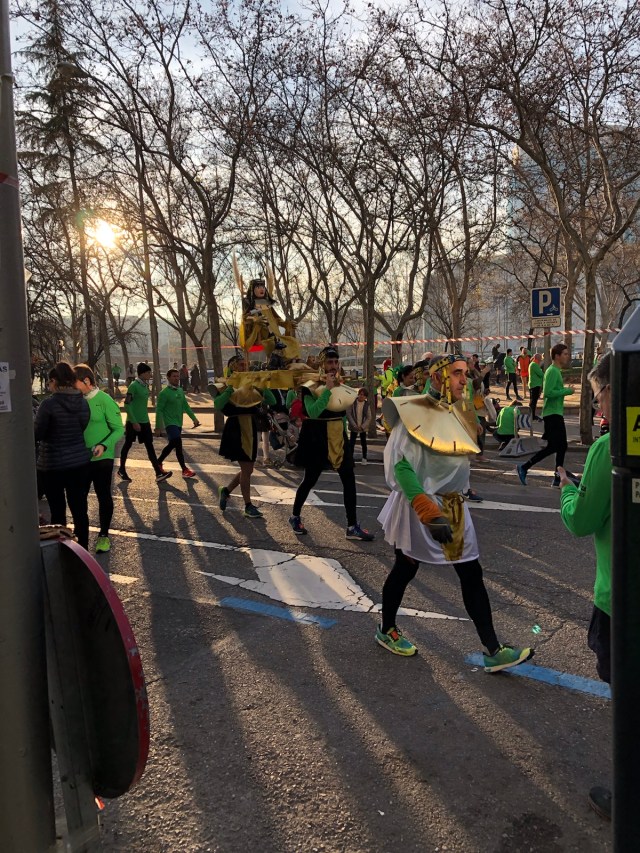 El atardecer atenuado por las luces navideñas da paso a la noche, a los aplausos, a un Madrid cálido y espectacular de luz, sonido, risas, aplausos que ahogan las pisadas y el cansancio que se va notando, dejamos atrás Atocha, un pasillo de luz con humo y una calle que dibuja su cuesta hacia arriba. Jorge va muerto, yo voy recuperándome de mis necesidades fisiológicas y puedo subir el ritmo, pero me quedo con el, quiero cruzar esta primera meta a su lado, ya que tiene algo de culpa que yo esté haciendo esta carrera. Terminamos en una hora con seis minutos, el objetivo era terminar y despedir el año corriendo, objetivo cumplido y a por las uvas.