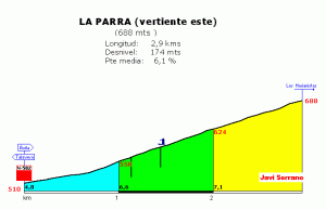 Empiezo a pedalear con otro ánimo que ayer, hasta donde mis piernas y ganas aguanten. La primera cagada del día cargar la ruta en sentido contrario, no me molesta porque la ruta es sencilla de seguir pero resulta molesto y no quiero estar buscando la opción de anular trayecto. Me toca subir la Parra un mini puerto que me separa de Arenas De San Pedro y que es corto pero se me hace pesado, dejo su altimetría de altimetrías.net para que vais el calentamiento tan divertido del día.