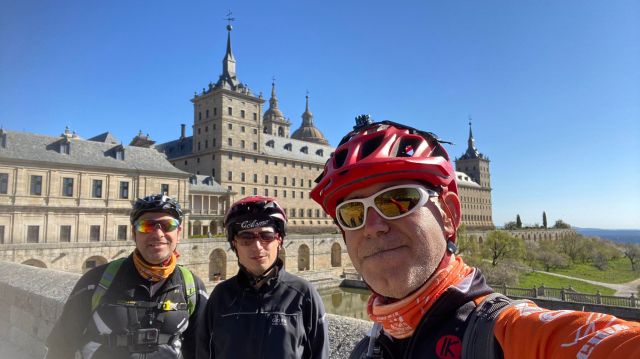 En Atocha me junto con Gonzalo y juntos tomamos el tren que nos dejará en el Escorial y a su paso por Chamartín recogerá a Jorge. Me gusta viajar en tren, la combinación tren bici para mi es el combinación perfecta para disfrutar de este deporte si la ruta no es circular. El día es soleado, algo frío pero no intenso, no molesto. Tras un café en la estación comenzamos nuestra ruta hacia el monasterio donde grabo la entrada del video blog y algunas tomas con la perspectiva lateral del monasterio.
