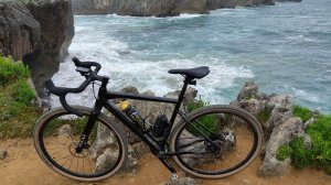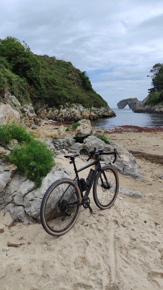 Recorrer las sendas estrechas me dicen que es una locura para la gravel, pero es una delicia y si te gusta disfrutar de la bici este tipo de recorridos es flow en vena. La siguiente playa en visitar es la de Cuevas del Mar. Me trae grandes recuerdos del año pasado de los días que pasamos haciendo rutas con la flaca con JJ y nos vinimos un día a bañarnos a esta playa, pequeña y recogida entre grandes formaciones rocosas. Continuo la senda hasta la playa de la Guelgüa, una playa que me recibe con marea baja y es otra playa de estas cerradas, pequeñas donde el azul del mar comparte protagonismos con el verde intenso de la costa. El paisaje hacia al mar de esta playa es espectacular con una formación rocosa en forma de arco y en su fondo hacia la costa toda una explosión de agua dulce y naturaleza compartiendo protagonismo.