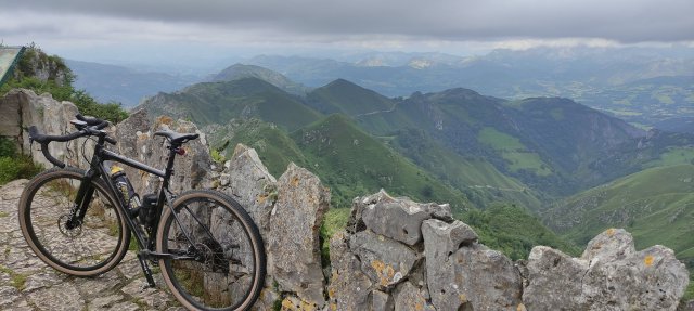 Entro en el aparcamiento y dos coches tras de mi lo completan, el día esta ideal para disfrutar de Asturias. Grabo la entrada para el blog y comienzo la ascensión con el replicar de las campanas de fondo, en la rotonda me quedo sin desarrollo ya no tengo mas piñones y creo que tampoco fuerzas, subo como puedo a golpes de ilusión, tiran de mi ganas por pasar un día en la montaña, de divertirme grabando una ascensión sufriendo como muchos de los que leen este blog lo hacemos dejandonos el alma en cada pedalada, pero disfrutando cada segundo entre jadeos de paisajes increíbles.