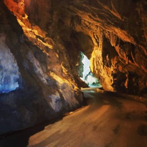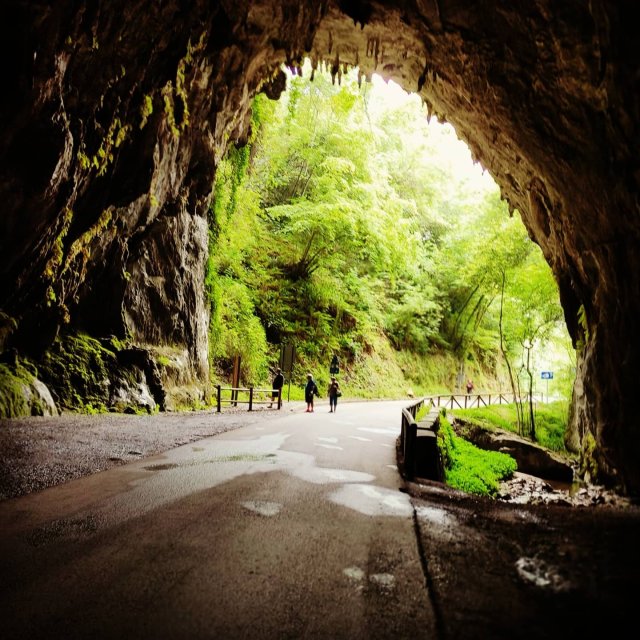 La ascensión para ser Asturias es cómoda, dejo atrás Ardines y me encuentro con la carretera que dice mi track que tengo que seguir cortada. Pregunto a un lugareño y me aconseja una ruta alternativa que me dice que es mucho más bonita, ya me temo yo que voy a sufrir cuestas. Circulo por una carretera con poco tráfico, típica de Asturias rodeado de una vegetación exuberante para las que estamos acostumbrados al marrón seco de terruño. Tras una seria de subes y bajas de los de dos dígitos en el altímetro me encuentro en la boca de entrada de la cuevona y te das cuenta de que esta maravilla es de obligada visita. Impone su entrada, la belleza de su entorno, entro despacio y se siente la humedad, la sensación de amplitud de cerrada, como cuando entras en una catedral y es que la cuevona es un templo natural que visitar, cuidar y dar el valor que se merece. Los disfruto dos veces para no perderme la experiencia recorriendo en cada sentido, disfrutando sus vistas en ambas caras y quedo maravillado.