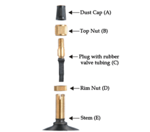 • Vástago de válvula Presta : sostiene el núcleo de la válvula con rosca interna. El roscado externo en el vástago permite el uso de tuercas para fijar en la llanta