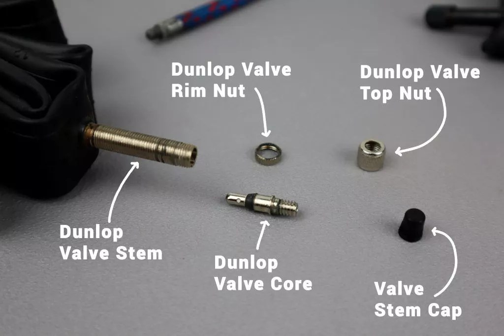 • Vástago de válvula Dunlop : el núcleo de la válvula se encuentra dentro del vástago de la válvula y se mantiene en su lugar mediante la tuerca superior, que se atornilla en la rosca exterior. El roscado externo de los vástagos también permite el uso de una tuerca de borde.