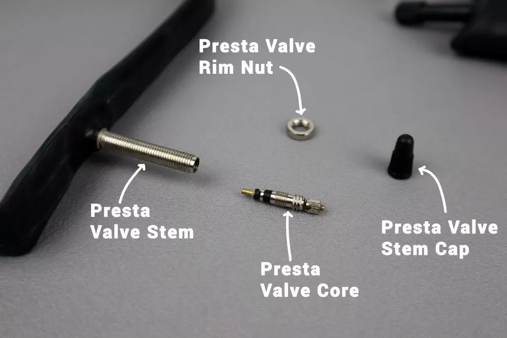 • Vástago de válvula Presta : sostiene el núcleo de la válvula con rosca interna. El roscado externo en el vástago permite el uso de tuercas para fijar en la llanta