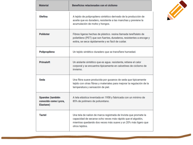 Los materiales mas comunes utilizados para confeccionar los calcetines de ciclismo son varios ya que casi nunca son creados a partir de un solo material. En cambio, a menudo se tejen a partir de mezclas de diferentes tejidos que brindan ciertos beneficios, dependiendo de las metas que vallamos buscando.