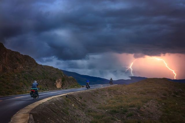 ¿Puedes pedalear fuera de la tormenta? Esta es otra llamada a nuestro sentido común. Lo más seguro que puedes hacer si no hay refugio disponible es bajarte de la bicicleta y alejarnos de ella unos 30 metros, deja con ella todo lo que sea de metal. Esto significa cinturones, accesorios, mochilas con bordes de metal y cualquier otra cosa. La propia bicicleta, ya sea de aluminio o de carbono, también atraer rayos. Muy importante una vez alejados ponerse en cuclillas ( no acostarse ) en el área más baja que puedas encontrar. Mientras está en cuclillas, trata de mantenerte alerta y con los talones juntos,