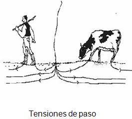 Es el mismo principio que ocurre cuando una vaca y una persona están parados en un prado cuando cerca de ellos cae un rayo.¿Por que es mas probable que resulte muerta la vaca que la persona? El fenómeno a que nos referimos se llama «voltaje en escalon». La vaca tiene una la distancia entre sus patas mucho mayor que la distancia entre los pies de la persona, por lo cual experimenta una mayor diferencia de potencial entre sus extremidades.