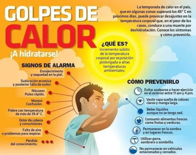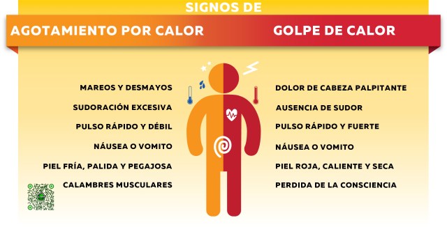 Los signos del golpe de calor que es más peligroso y debe ser tratado por profesionales médicos los puedes ver en la infografía anterior y podrás apreciar la diferencia con el agotamiento por calor. Si cree que alguien está experimentando estos síntomas, debe ser llevado a un hospital.