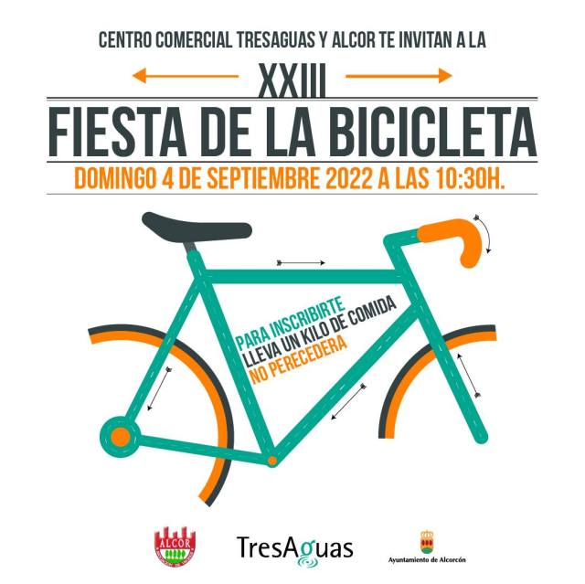 El próximo domingo 4 de septiembre de 2022 tendrá lugar en Alcorcón su XXIII de la fiesta de la bicicleta. La concentración y salida tendrá lugar en la plaza San Pedro Bautista a las 10:30 y la Llegada en el exterior del centro comercial Tres Aguas.